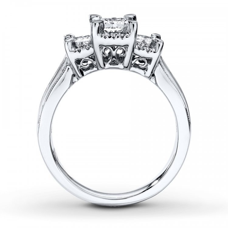 Representing your past, present and future together, this three-stone ring dazzles with a trio of princess-cut diamonds framed in round diamonds as its centerpiece. More round diamonds are channel-set along the band of 14K white gold to complement. The ring has a total diamond weight of 1 carat.
